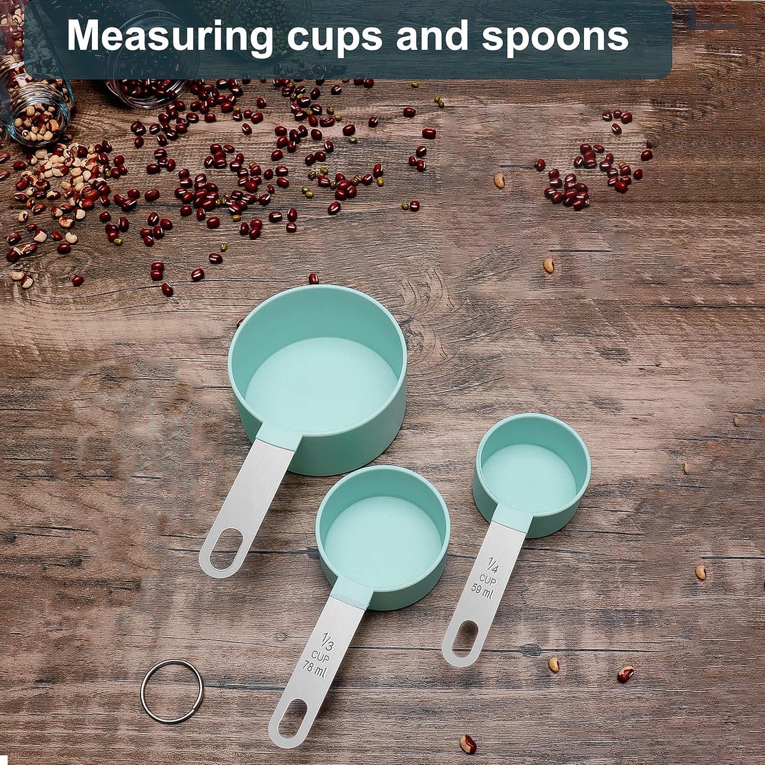 Ensure accuracy in your cooking and baking with this premium 3-piece measuring cup set. Designed for home chefs and bakers, this set includes 1/3 cup (78 ml), 1/4 cup (59 ml), and 1/8 cup (30 ml) sizes – perfect for measuring both dry and liquid ingredients. The sturdy stainless steel handles are engraved with permanent measurements, while the mint green plastic heads add a stylish, modern touch.